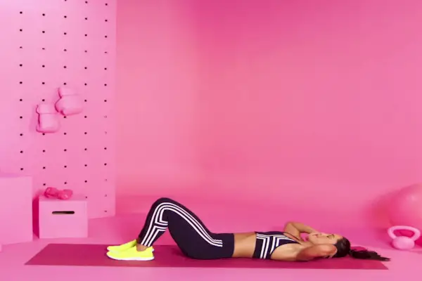 Jak: Zacznij od pleców, z ugiętymi kolanami, stopami na podłodze około 6 cali od pośladków i rękami za głową. Trzykrotnie unieś klatkę piersiową w kierunku sufitu, trzymając dolną część pleców dociśniętą do maty. Opuść ramiona, aby odpocząć na macie. Trzymając stopy zgięte, trzykrotnie podnieś pięty prosto w stronę sufitu, za każdym razem odsuwając biodra od maty o 2 do 3 cali.