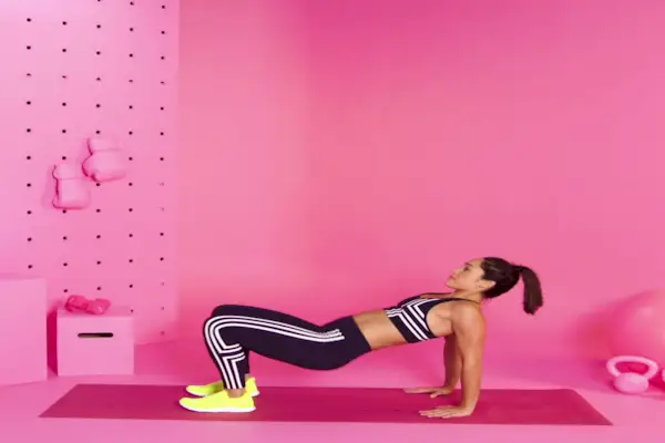 Jak: Zacznij od odwróconej pozycji blatu. Biodra powinny być uniesione, ramiona powinny znajdować się nad nadgarstkami, a kolana nad stopami. Trzymaj klatkę piersiową otwartą, aby ciało było płaskie. Powoli opuść biodra w dół i przez ramiona, jednocześnie prostując nogi i utrzymując biodra nad ziemią. Pociągnij ciało z powrotem, aby rozpocząć i powtórz.