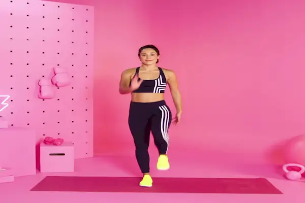 Jak: Zacznij w pozycji stojącej na macie. Podnieś prawe kolano na wysokość bioder, trzymając stopę zgiętą i wyciągając lewy łokieć do przodu, podczas gdy prawy łokieć cofa się. Wróć do stania z rękami po bokach, a następnie powtórz po przeciwnej stronie. Kontynuuj naprzemienne strony i przyspieszaj, aby uzyskać dodatkowe wyzwanie.